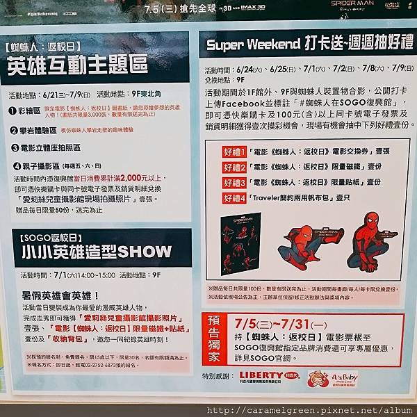 電影《蜘蛛人返校日》將上映,在復興SOGO(BR4)有一個造勢活動,即日起到7/9,每個週五、六、日,在SOGO復興館的9樓,都有設置一個專屬超級英雄迷的區域。