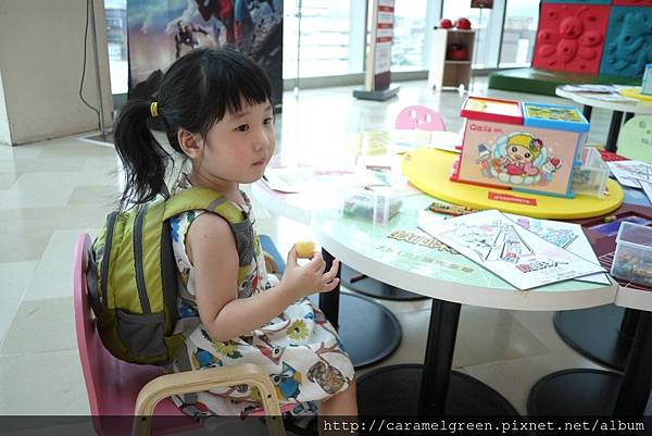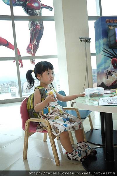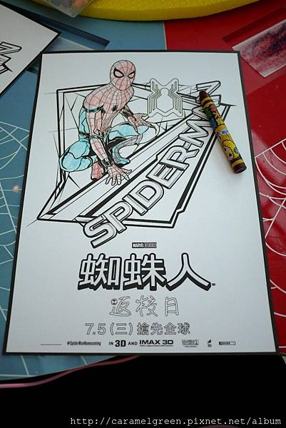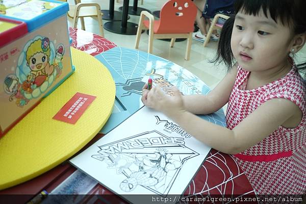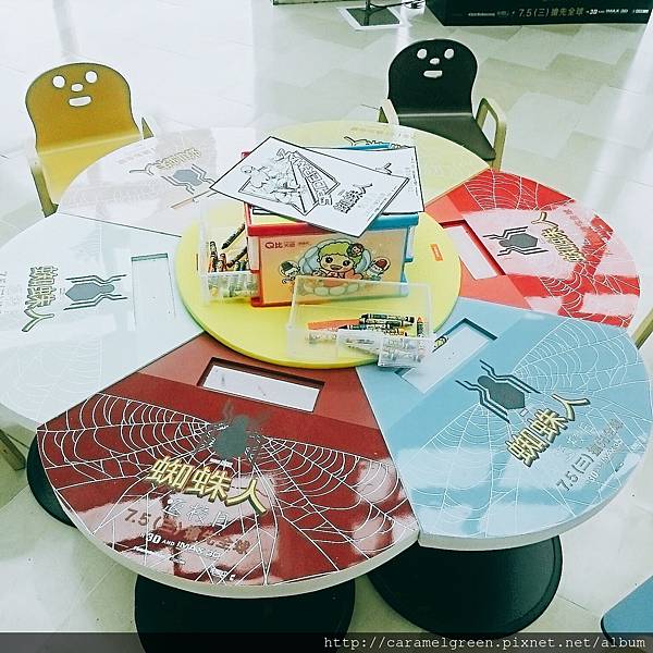 不得不說,SOGO真的很用心,這些蠟筆的數量跟顏色真的很多!還會不定時補充蜘蛛人的著色紙,如果不夠,可以去電扶梯旁邊的服務台領取。桌子也是蜘蛛人的圖案,真是太有誠意了!