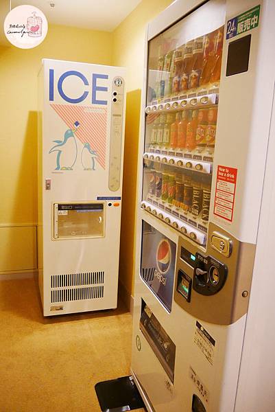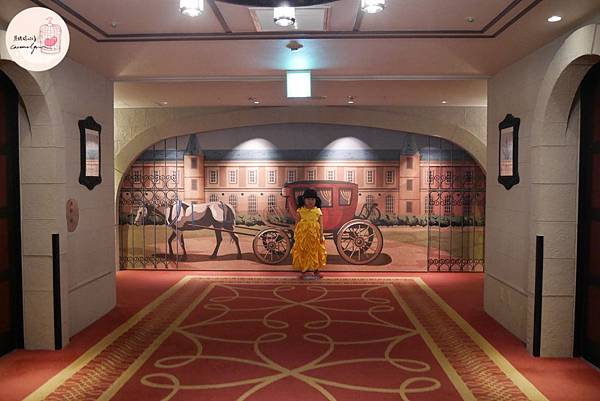 走廊上都有不同的公主擺設,地毯也充滿巧思,電梯旁邊有小空間,裡面有冰塊機、飲料販賣機跟椅子,可以坐在那邊看海,海的那一邊就是台場。