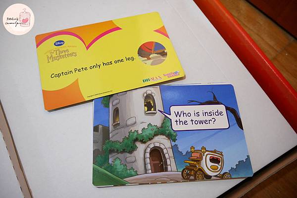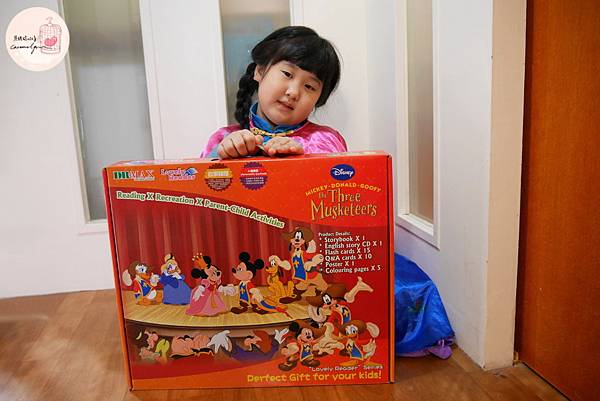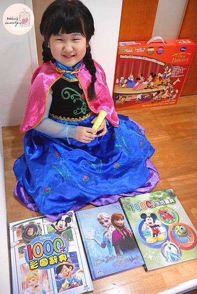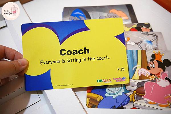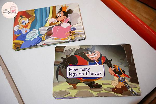 裡面有生字卡、例句卡、原文書及有聲CD、5張著色紙、1張小海報,全部都由迪士尼主要角色擔綱,光是這盒就要價千元啊!